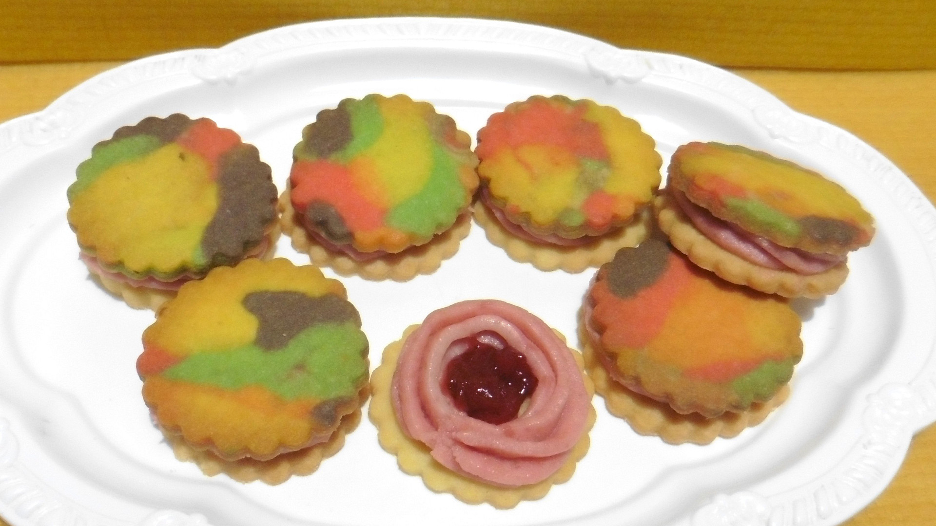 Krok 7: Na jednobarevné, prochladlé kolečko nastříkáme cukrářským sáčkem se zdobicí špičkou kolem obvodu krém, doprostřed dáme trochu marmelády a přiklopíme barevným kolečkem. Stejným způsobem připravíme všechna kolečka.