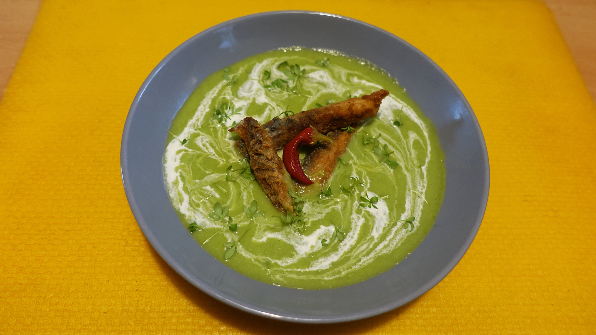 Krok 6: Polévku na talíři zakápneme smetanou, vidličkou lehce promícháme, položíme hranolky, chilli papričku a posypeme řeřichou.