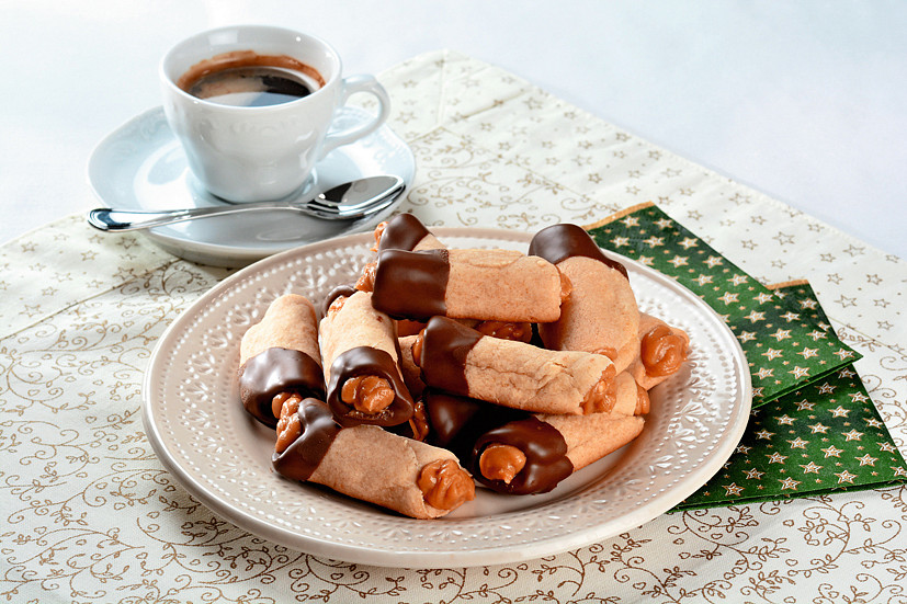 Plněné křehké trubičky z medového těsta, nesmí mezi cukrovím nikdy chybět. Trubičky plněné krémem ze Salka a arašídového másla, namáčené v ledových kaštanech, vám svou lahodnou chutí vykouzlí úsměv na tváři.
