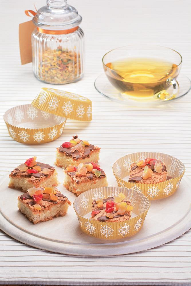 Ze zbylých bílků snadno připravíte perfektní moučník, který se hodí nejen na sváteční stůl. Nadýchané bílkové řezy s mandlemi a kandovaným ovocem, ozdobené čokoládovou polevou, jsou jemné a příjemně sladké.