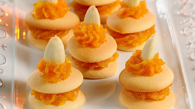 Krok 5: Meruňkovou pastu přendáme do cukrářského sáčku. Na piškot naneseme vrstvu pasty, poté překryjeme ještě jedním piškotem a navrch opět naneseme pastu.