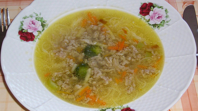 Horká a sytá polévka přijde v chladných dnech vždycky vhod. Vývar z mletého masa s kořenovou zeleninou a nudlemi je velice snadný na přípravu a perfektně poslouží jako první jídlo vydatného obědu.