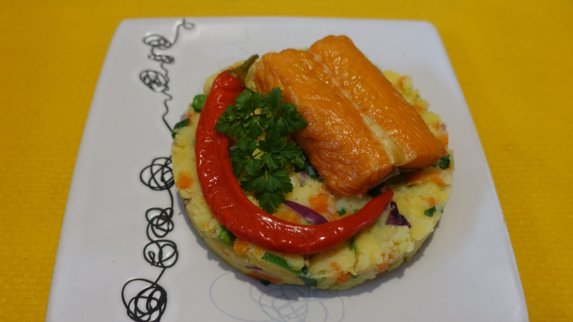 Uzený losos je velmi oblíbený do pomazánek, tortill i salátů. Zkuste však kousky uzené ryby ohřát v troubě. Podávat můžete se šťouchanými bramborami s pórkem, mrkví a hráškem. Toto snadné a pestré jídlo si jistě oblíbíte.