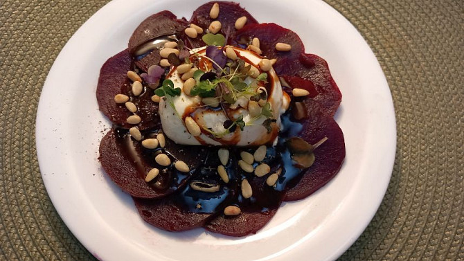 Exploze chutí v jednoduchém, ale efektním předkrmu. Zemitou chuť červené řepy vyváží lahodný krémový sýr burrata. Křupavý element zastoupí piniové oříšky a zálivka z balzamika, medu a oleje už jen podtrhne tuto dokonalou kombinaci.