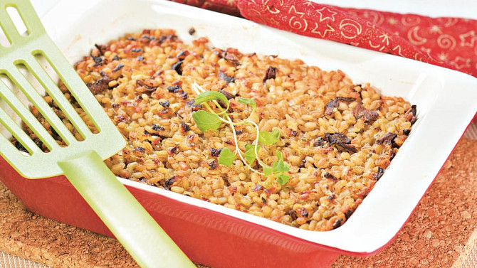 Krok 4: Uvařené kroupy slijeme, propláchneme a vložíme do připraveného pekáčku.