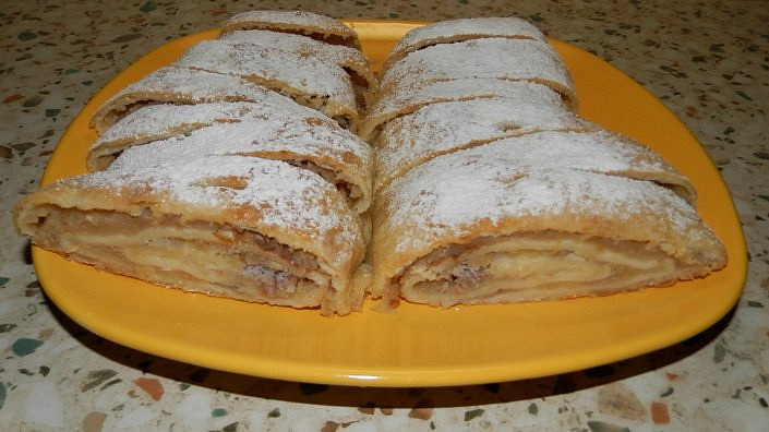 Není nad čerstvě upečený štrúdl od maminky, který voní po skořici a jablkách. Díky přidanému jogurtu bude těsto krásně vláčné. Na chuti přidá ještě strouhanka opečená na másle, která také pojme zbývající šťávu z jablek.