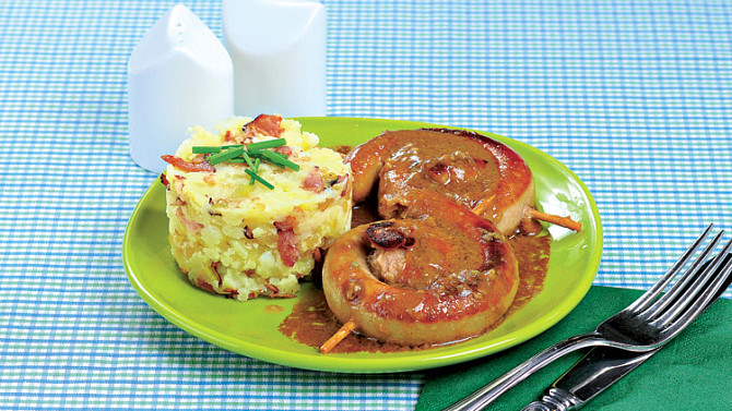 Krok 2: Vinnou klobásu nakrájíme na porce a svineme do spirál. Aby maso nevyteklo, sepneme je špejlí.