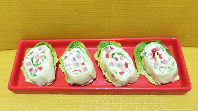 Rychlé, chutné a efektní pohoštění. Tortilly se potřou náplní z tvarohu a taveného sýra, naplní paprikami, salátem, sýrem a salámky, pevně srolují a nakrájí na malé roládky, které se skvěle hodí na oslavy i jako lehká svačina.