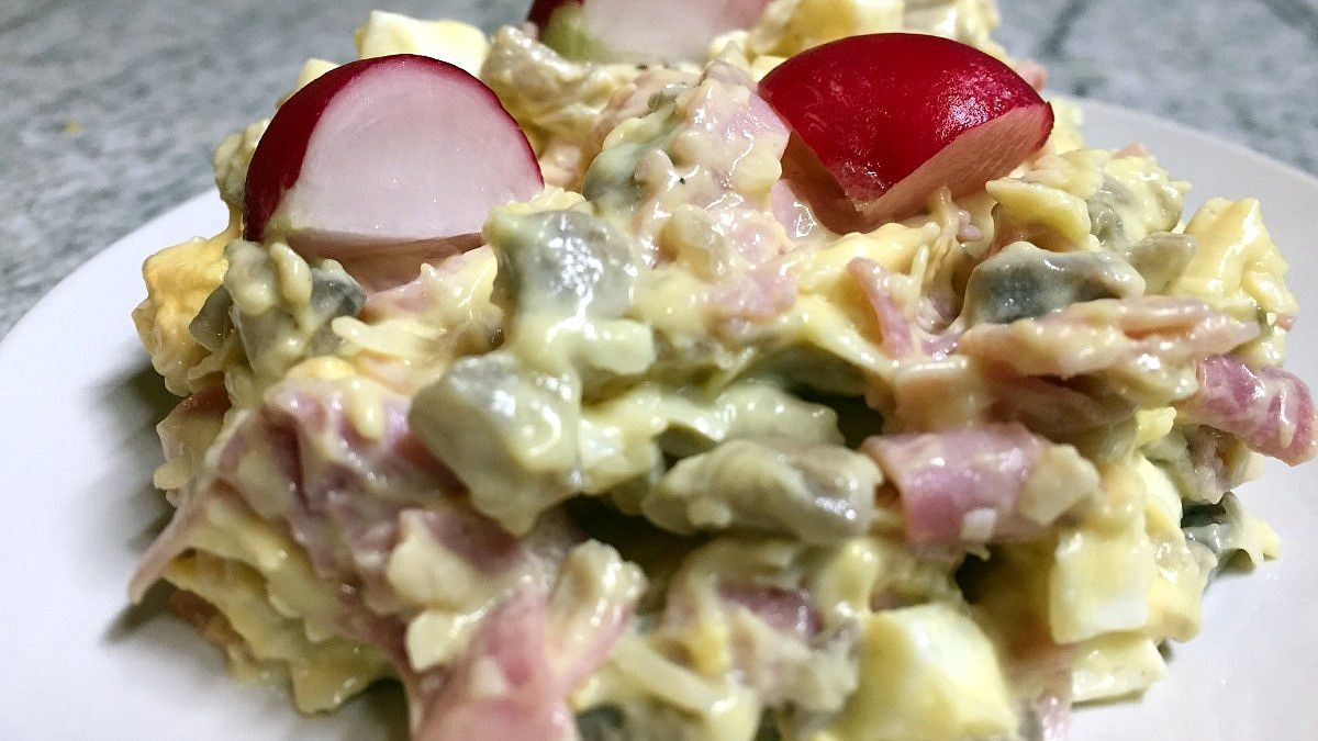 Salát Emerald vyniká výraznou chutí a originálním spojením čerstvých hub s vejci, šunkou a parmazánem. Po odležení ho stačí jen dozdobit okurkou či jinou čerstvou zeleninou a podávat s křupavým pečivem.