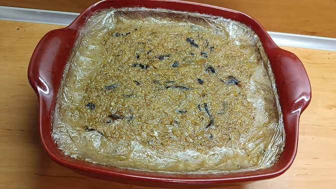 Krok 5: Směs vložíme do pekáčku, kastrolu nebo keramické mísy vymazané tuhým sádlem, a pečeme na 175 °C zhruba 45 minut. Pak necháme ještě chvíli odstát - volná tekutina se musí vsáknout.