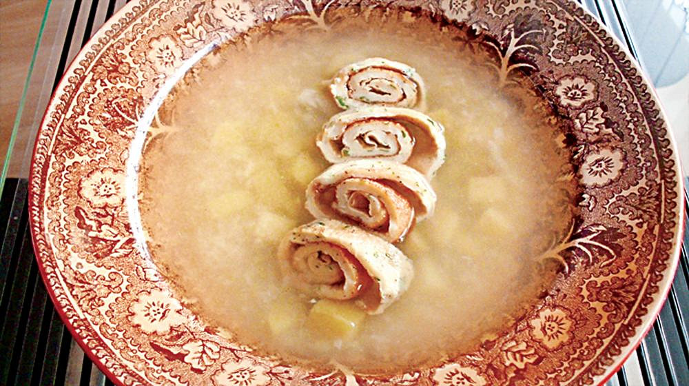 Česnečka patří mezi oblíbené české polévky, které zahřejí a postaví na nohy. V této variantě ji doplňují jemné roládky z tenkého těsta, připomínající celestýnské nudle, které polévku krásně zjemní.