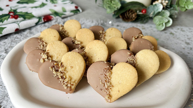 Krok 8: Nakonec polovinu každého srdíčka namočíme do rozpuštěné mléčné čokolády a hned posypeme drcenými lískovými oříšky. Necháme čokoládu ztuhnout a skladujeme v chladu.