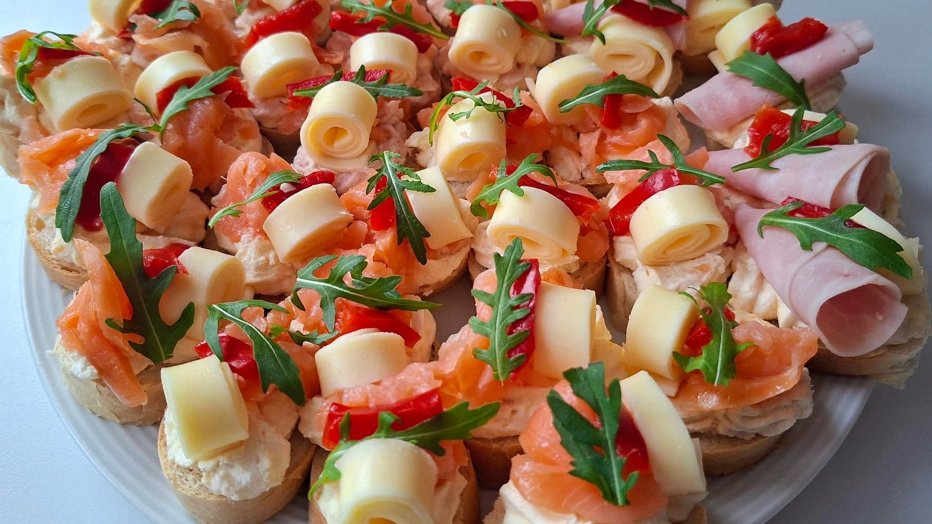 Tyhle lákavé jednohubky jsou zdobené vaječnou pomazánkou ze žervé a mini rolkami ze sýra a uzeného lososa. Proužky červené papriky a rukola jednohubky krásně osvěží a dodají hezké barvy. Chutná kombinace, která skvěle nahradí salámové a šunkové varianty.