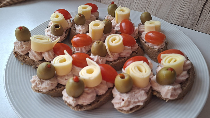 Chuťovky se šunkovou pomazánkou, olivami a sýrem