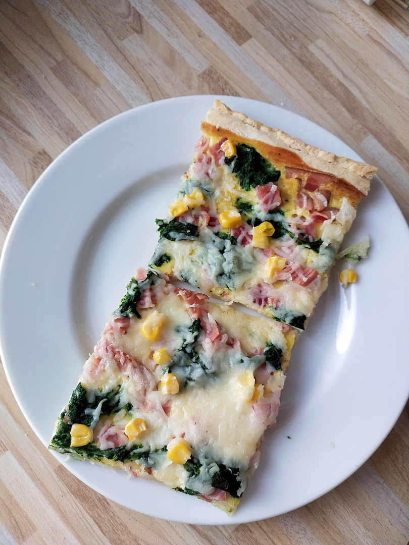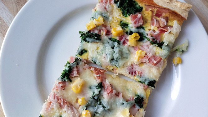 Jednoduchý slaný koláč z listového těsta, dokořeněný jen pepřem a solí, obsahuje vajíčka, špenát, kukuřici, sýr a šunku. Pokud jej budete připravovat pro vaše nejmenší, vyberte šunku pro děti s nižším obsahem soli.