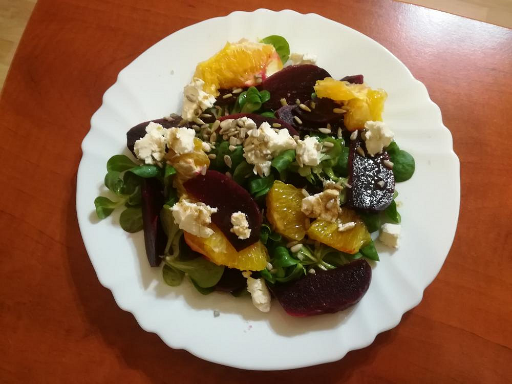 Salát s řepou, pomerančem a medovým kozím sýrem