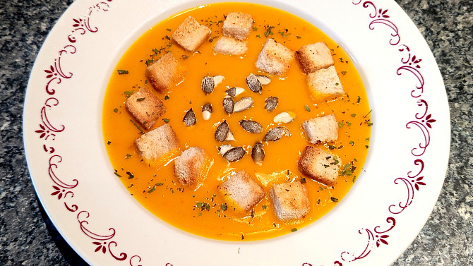 Krok 11: Podáváme s opečenými krutonky a dýňovými semínky.