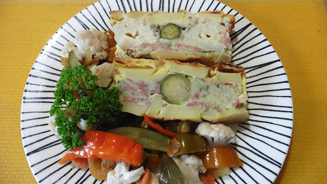 Zapečené brambory, které vypadají na řezu skutečně nádherně. Přesně takové jsou brambory, připravené podle tohoto receptu. Skládají se ze strouhaného sýra, šunky, růžičkové kapusty, květáku a vaječné zálivky.