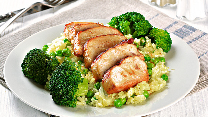 Hledáte zdravý a lehký oběd nebo večeři a už vám docházejí nápady? Vyzkoušejte decentně ochucená kuřecí prsa, orestovaná dozlatova a doplněná dušenou rýží s hráškem, šťávou z výpeku a blanšírovanou brokolicí.