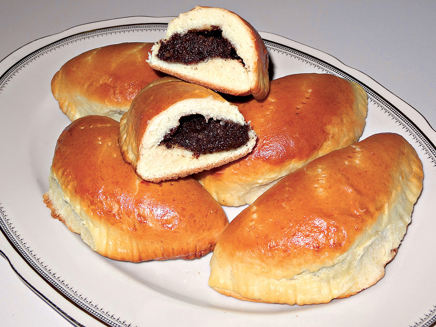 Krok 8: Na pomoučené ploše rozválíme válečkem bochánky na oválné placky. Každou placku potřeme makovou náplní, přeložíme do tvaru mušle a okraje pevně přitlačíme vidličkou.