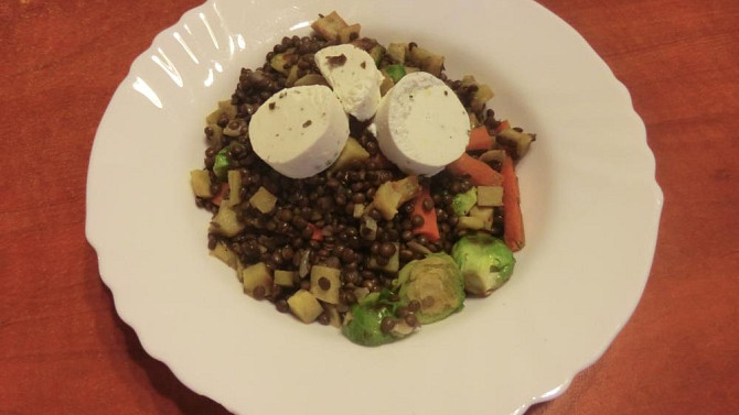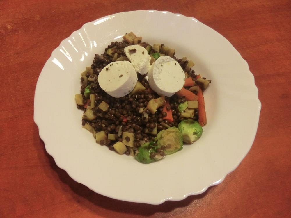 Francouzský čočkový salát s balzamikovou zálivkou, kozím sýrem, batátem a růžičkovou kapustou je skutečně originální. Nevšední kombinace chutí, která osvěží každodenní jídelníček. Vykouzlete tento odlehčený pokrm a uvidíte, že doma zaboduje.