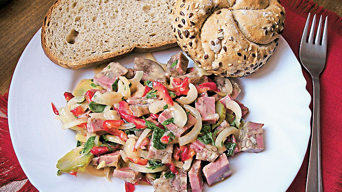 Tlačenkový salát s hořčicovo-octovou zálivkou zdobí nasekaná petrželka, kousky cibule a papriky. S čerstvým chlebem získáte výbornou a snadnou večeři nebo svačinu. Salát bude chutnat nejlépe, když ho necháte rozležet v lednici.