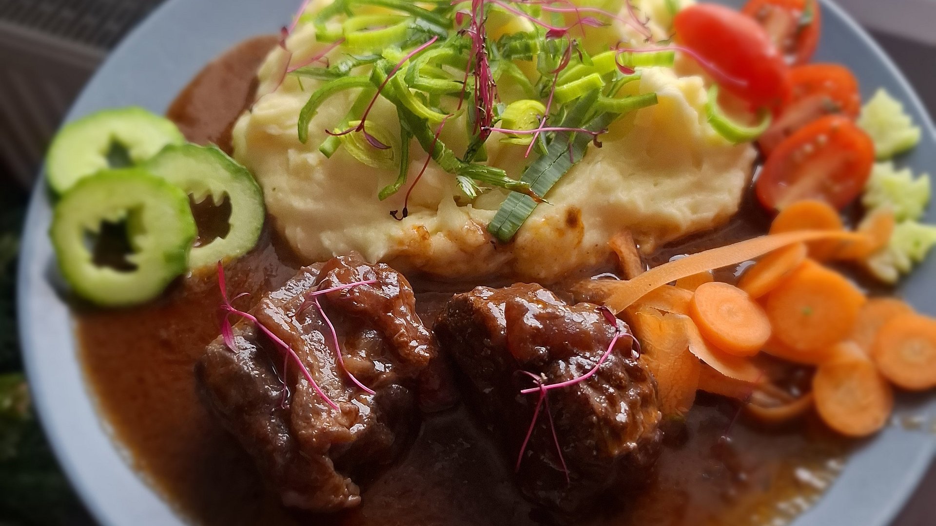 Hovězí maso na víně působí opravdu elegantně a vznešeně. Je to vskutku skvělý pokrm. Jemné, rozpadající se kousky hovězí kližky, dušené se zeleninou v červeném víně, můžeme doplnit třeba bramborovou kaší.