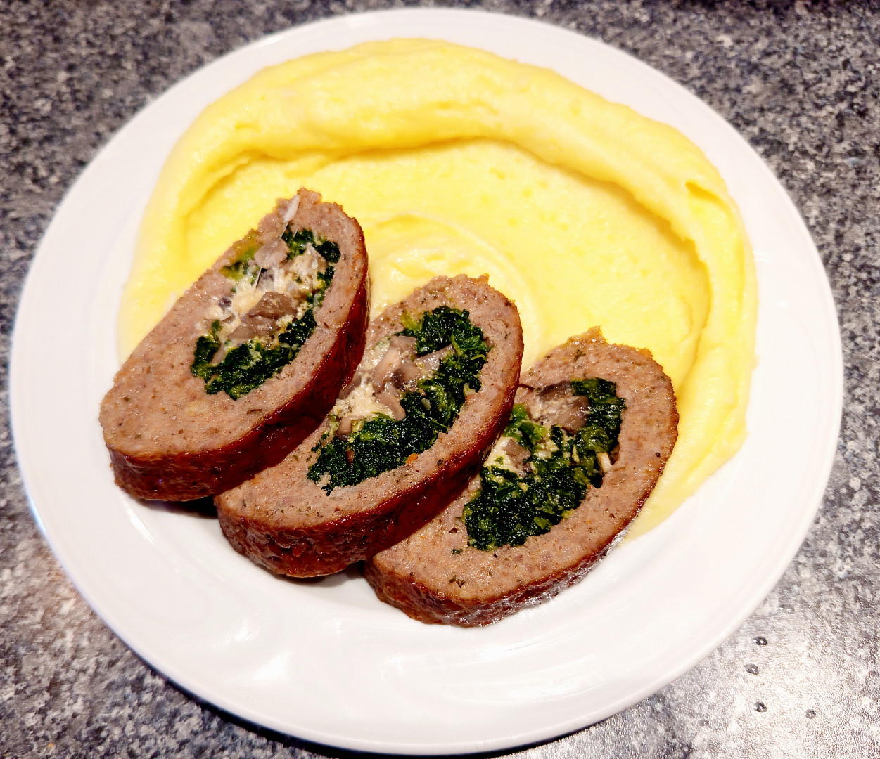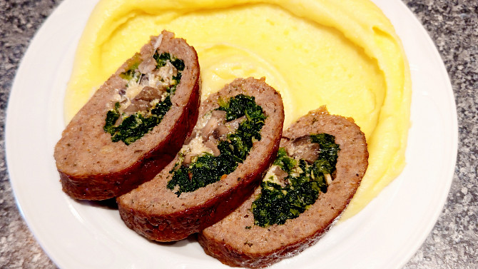 Marinovaná roláda z mletého masa plněná špenátem, žampiony a sýrem