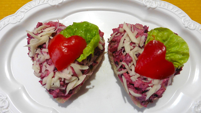 Chlebíčky ve tvaru srdíčka příjemně zpestří vaše valentýnské menu. Pomazánka z červené řepy a celeru je zjemněná majonézou a má krásnou růžovou barvu. V každém soustu navíc příjemně křupnou slunečnicová semínka.
