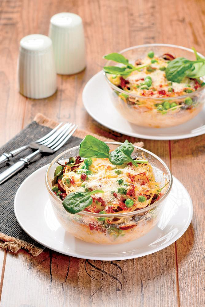 Zapečené těstoviny milují úplně všichni. Připravte roztomilá špagetová hnízda se žampiony, šunkou a hráškem. Těstoviny zalijte smetanovo-vaječnou směsí se strouhaným sýrem a upečte dozlatova. Sami uvidíte, že zmizí mrknutím oka.