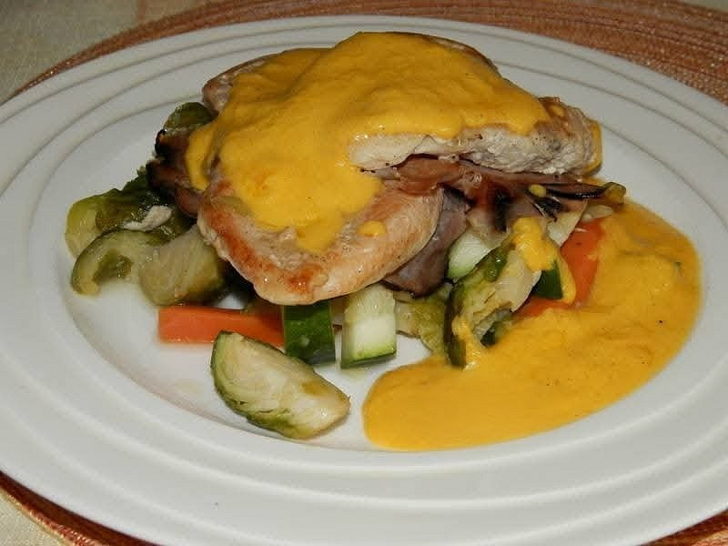 Vepřová kotleta s restovanou zeleninou a holandskou omáčkou