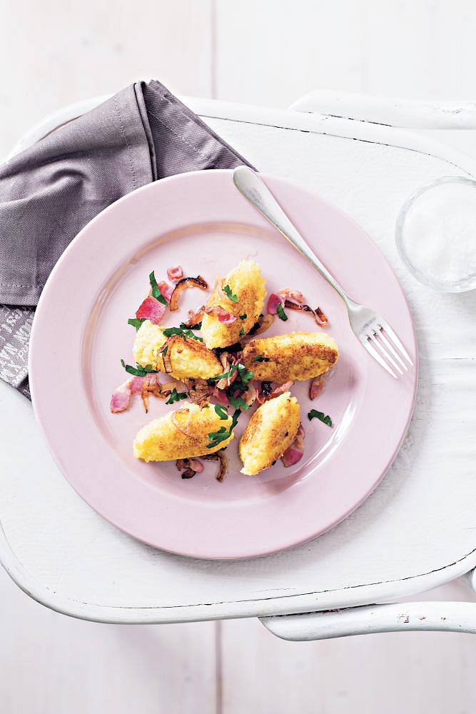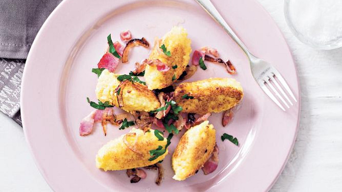 Krok 5: Lžící namáčenou v tuku vykrajujeme z jáhel škubánky a na talíři je přelijeme osmaženou cibulkou.