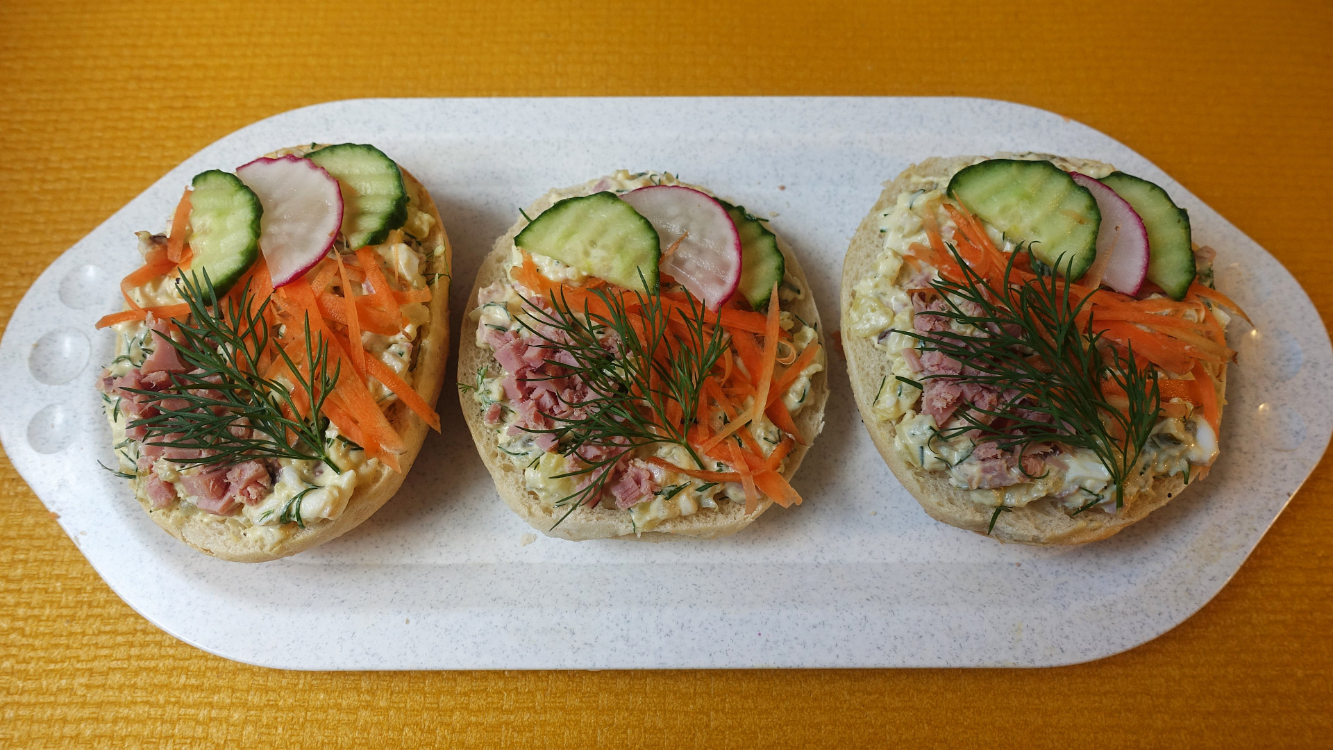Netradiční svačina připravená z housek promazaných voňavou pomazánkou. Z uzené panenky, brambor, kopru, kyselých okurek a dalších surovin vykouzlíte skutečnou pochoutku. Zeleninová obloha dodá tělu prospěšnou vlákninu.