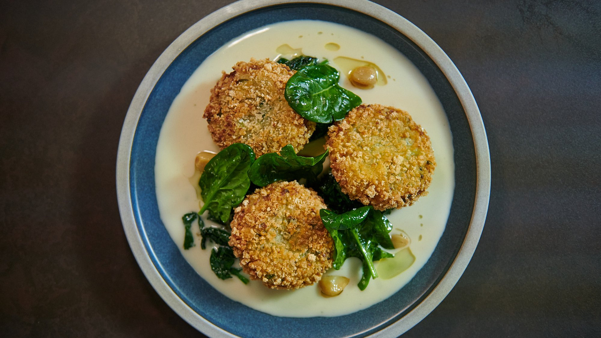 Křupavé, dozlatova vypečené karbanátky s modrým sýrem skvěle doplní krémová omáčka z konfitovaného česneku, a na másle orestované mladé špenátové listy. Dejte šanci i bezmasým pokrmům a připravte skvělý oběd nebo večeři podle kuchaře Marka Fichtnera.