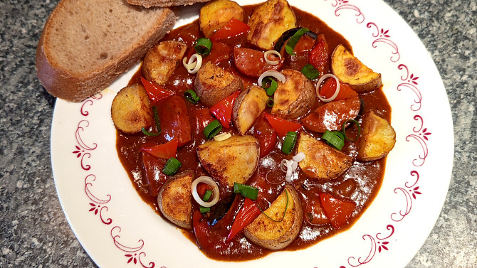 Brambory, uzenina a mletá paprika, to zpravidla znamená jedině guláš. Tuto kombinaci však můžete servírovat i překvapivě jinak. Kousky brambor a papriky upečte v troubě a podávejte je s omáčkou ze špekáčků, protlaku a piva.
