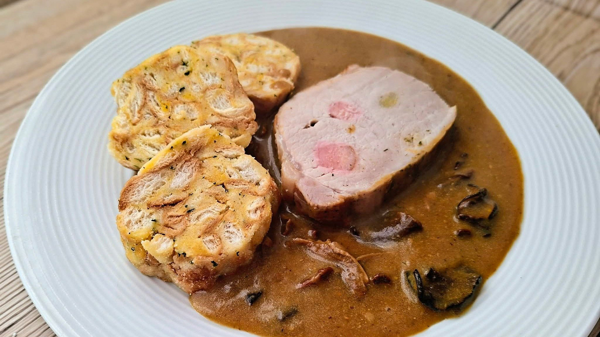 Špikovaná vepřová pečeně na houbách s karlovarským knedlíkem