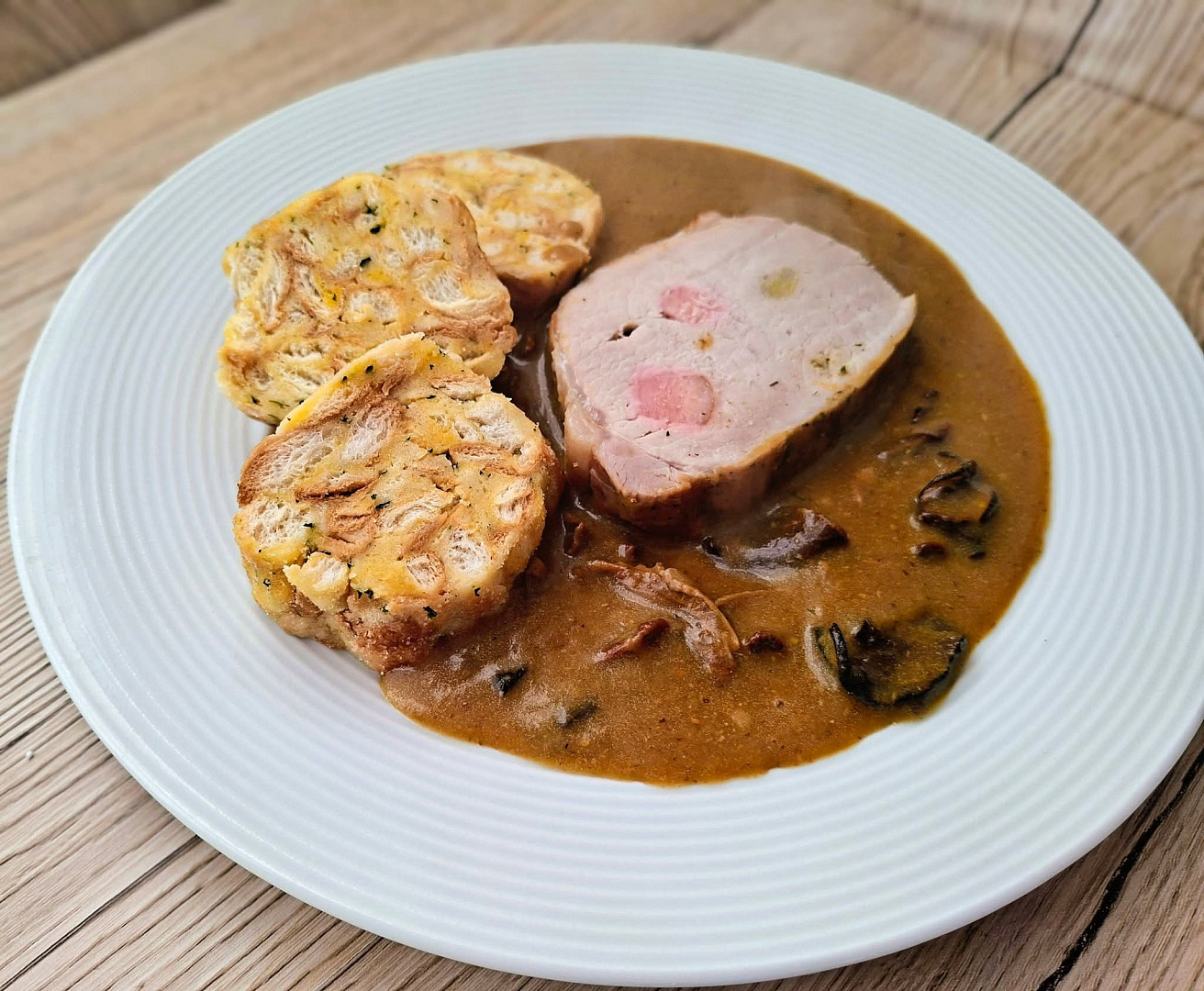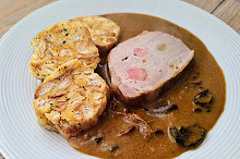 Špikovaná vepřová pečeně na houbách s karlovarským knedlíkem