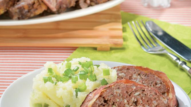 Výborná sekaná ve slaninovém kabátku. Ani byste nepoznali, že je nastavovaná ječnými kroupy. Voní česnekem, majoránkou a před pečením je potřená hořčicí. Snadná večeře z pekáčku. Stačí ji doplnit vařeným bramborem a můžete podávat.