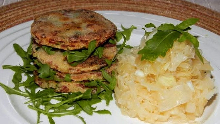 Bramborové placky se sýrem a slaninou, se salátem z kysaného zelí