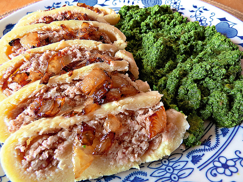 Bramborový závin je rychlejší alternativou k plněným bramborovým knedlíkům. Bramborové těsto naplňte uzeným masem, zabalte a uvařte v osolené vodě. Pak nakrájejte na úhledné plátky a podávejte posypané smaženou cibulkou.