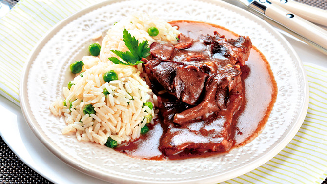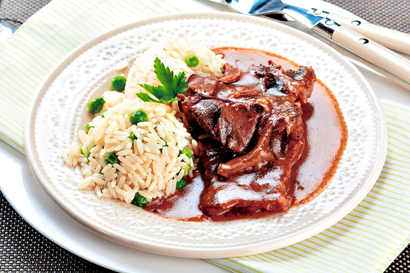 Dušená hovězí roštěná na houbách je poctivým českým pokrmem. Hodí se i jako nedělní oběd pro celou rodinu. Sušené houby propůjčí omáčce úžasnou vůni a hovězí vývar zase plnou chuť. S hráškovou rýží nejen skvěle chutná, ale i vypadá.