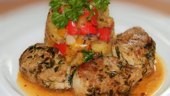 Vepřová panenka s bylinkami, pečenými bramborami a zeleninou