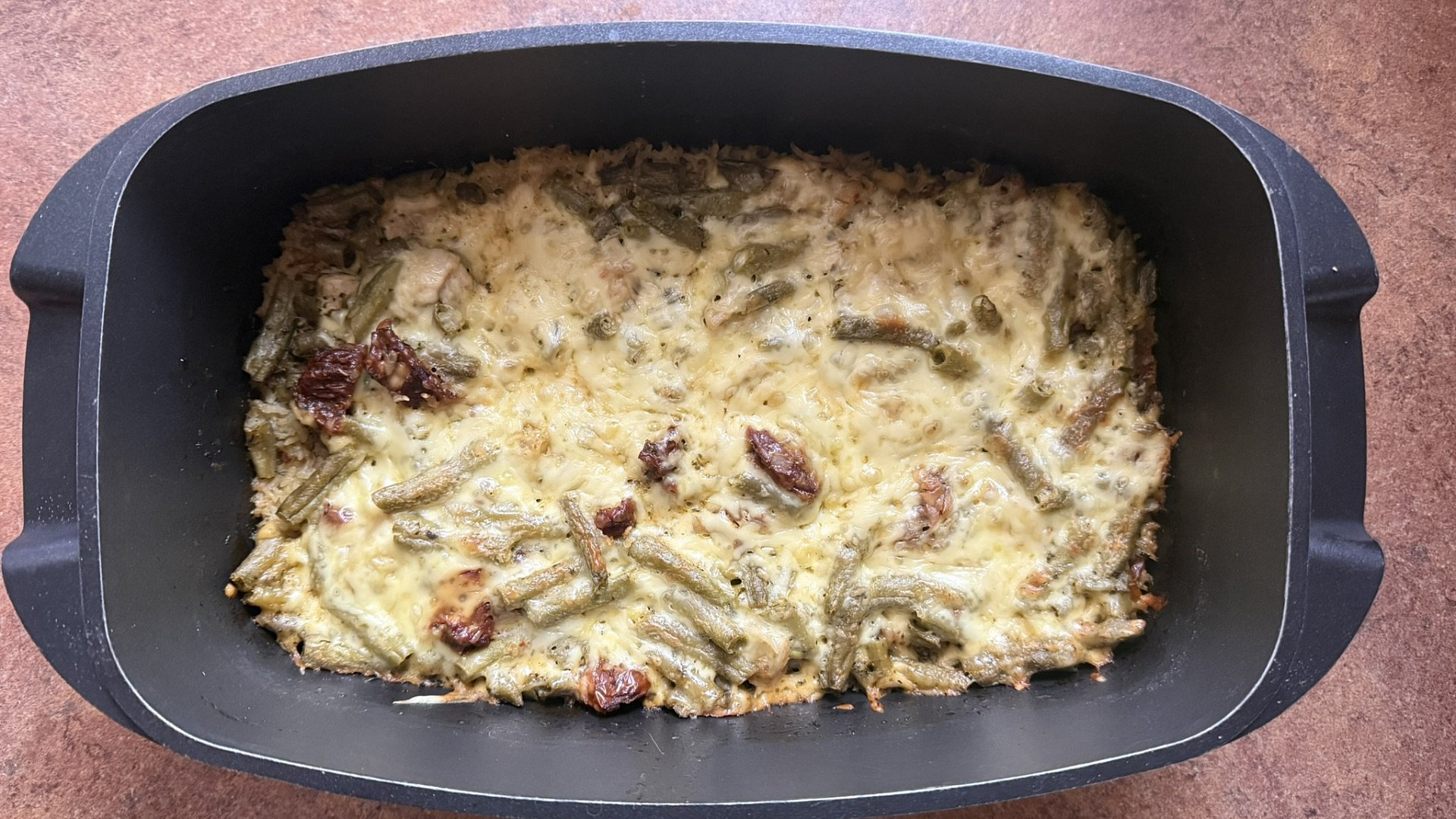 Hledáte způsob, jak během chvíle připravit sytý pokrm z jednoho pekáčku? Stačí nakrájet maso, smíchat ho s rýží, zelenými fazolkami, sušenými rajčaty a pestem, zalít vývarem a nechat péct v troubě. Na závěr pokrm zjemní zapečená mozzarella.