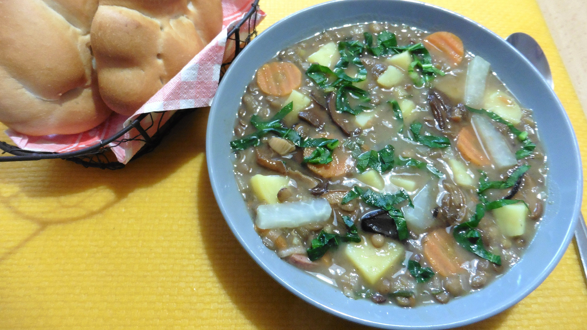 Bramborovo-čočková polévka s houbami