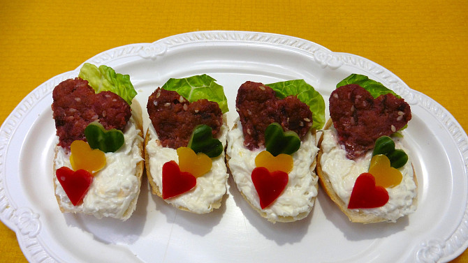Připravte svým nejbližším lahodné pohoštění v podobě lákavých a elegantních jednohubek. Plátky rohlíku s tvarohovou pomazánkou a strouhaným sýrem ozdobí drobná srdíčka ze zeleniny i z mletého masa spojeného s červenou řepou a sezamem.