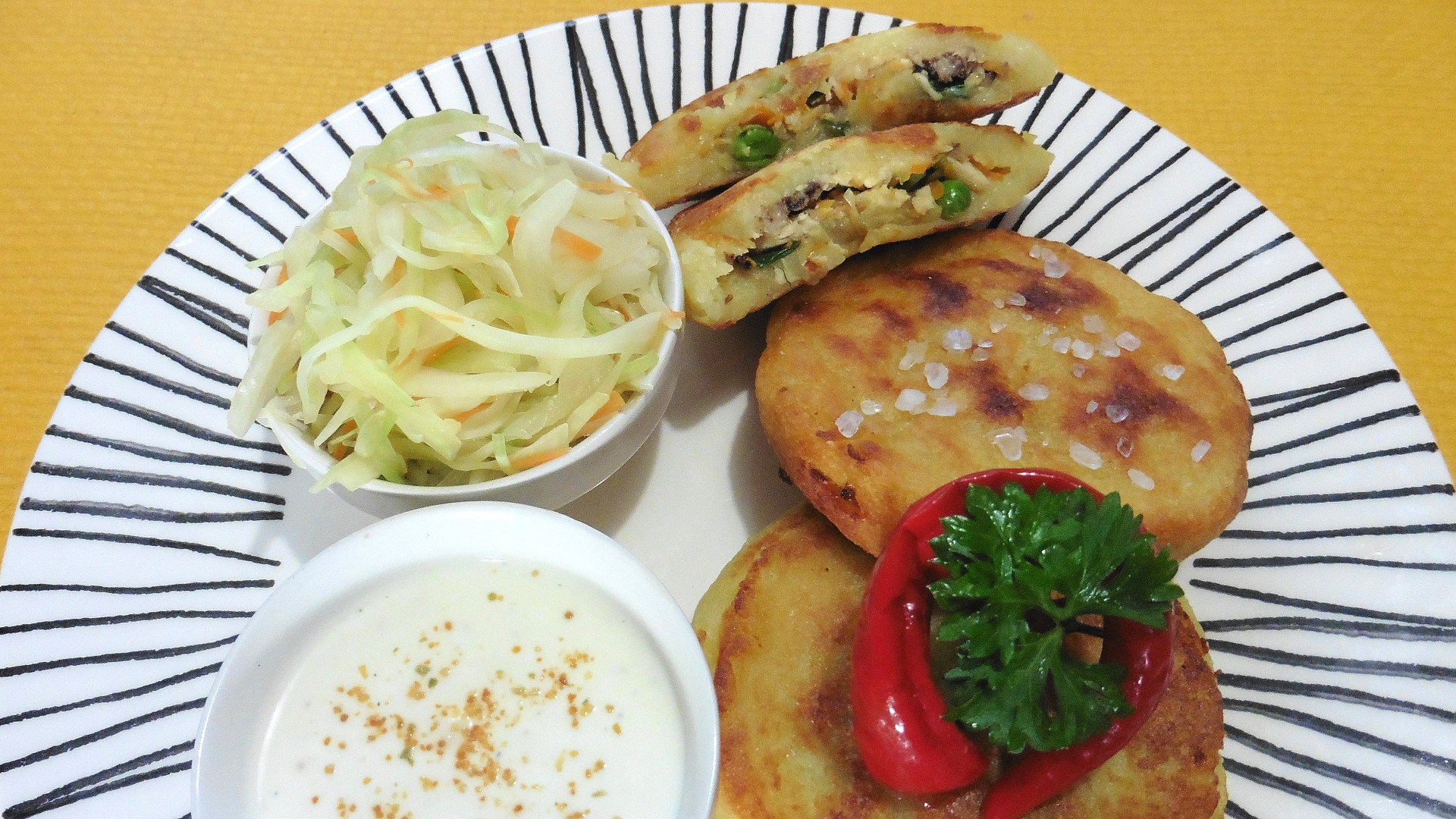 Bramborové placky plněné masovo‑zeleninovou směsí se připravují z jemně nastrouhaných vařených brambor, mouky, soli a prášku do pečiva. Náplň tvoří mleté maso, cibule, pórek, mrkev, celer a hrášek, které se krátce osmahnou a podusí.