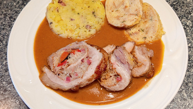 Bůčková roláda plněná zelím a omáčka z pečeného zelí