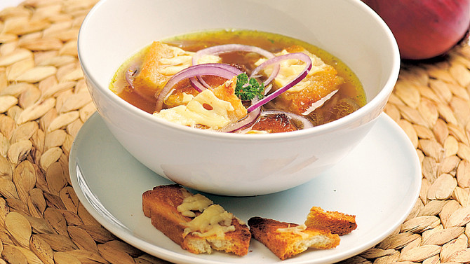 K přípravě chutné a hřejivé cibulačky se sýrovými krutony vám stačí jen pár základních surovin. Polévka je hotová do hodiny a potěší i svou nenáročností na rozpočet. Křupavé krutonky připravíte z toustového chleba a strouhaného sýra.