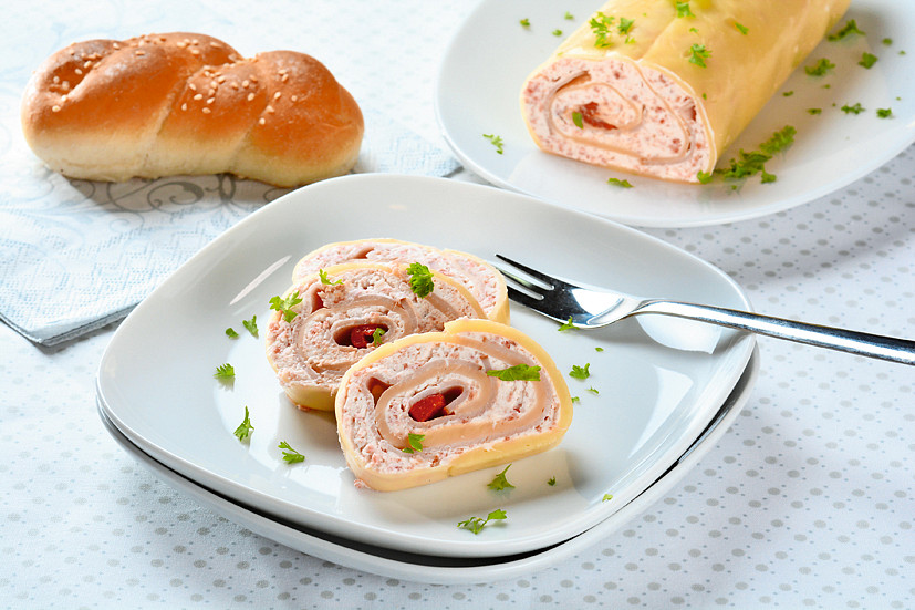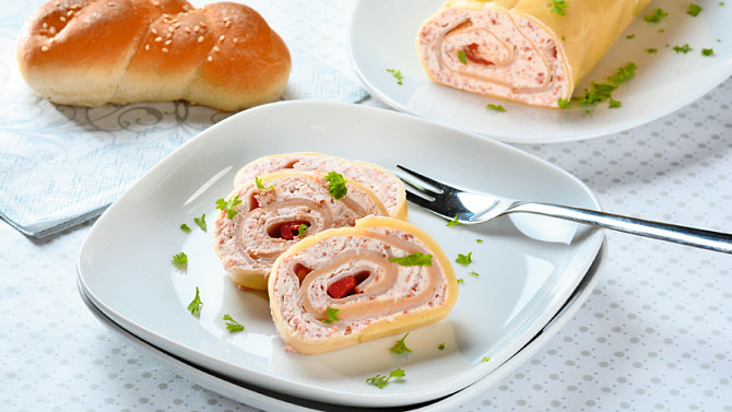 Krok 7: Plátky krájíme ostrým nožem, aby se roláda nezdeformovala. Podáváme s bílým pečivem nebo tmavým čerstvým chlebem.