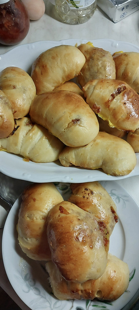 Použijeme zbylé uzené maso nebo zbylé kuřecí a trochu zelí (které také zbylo od oběda). Maso nasekáme na malé kousky, osolíme, okořeníme dle chuti a přidáme zelí, Krok 5: Plech vyložíme pečicím papírem. Včas zapneme nahřívat troubu na 180 °C. Krok 6: Po vykynutí těsto rozdělíme přibližně na 20 kousků, které rukou upravíme do obdélníčku, kraj rádýlkem několikrát nařízneme (viz foto). Krok 7: Na okraj každého obdélníčku urovnáme lžíci náplně a těsto stočíme do rohlíčku. Všechny rohlíčky uložíme na připravený plech. Krok 8: Pak rohlíčky potřeme rozpuštěným žloutkem a upečeme je ve vyhřáté troubě na 180 °C asi 25 minut.